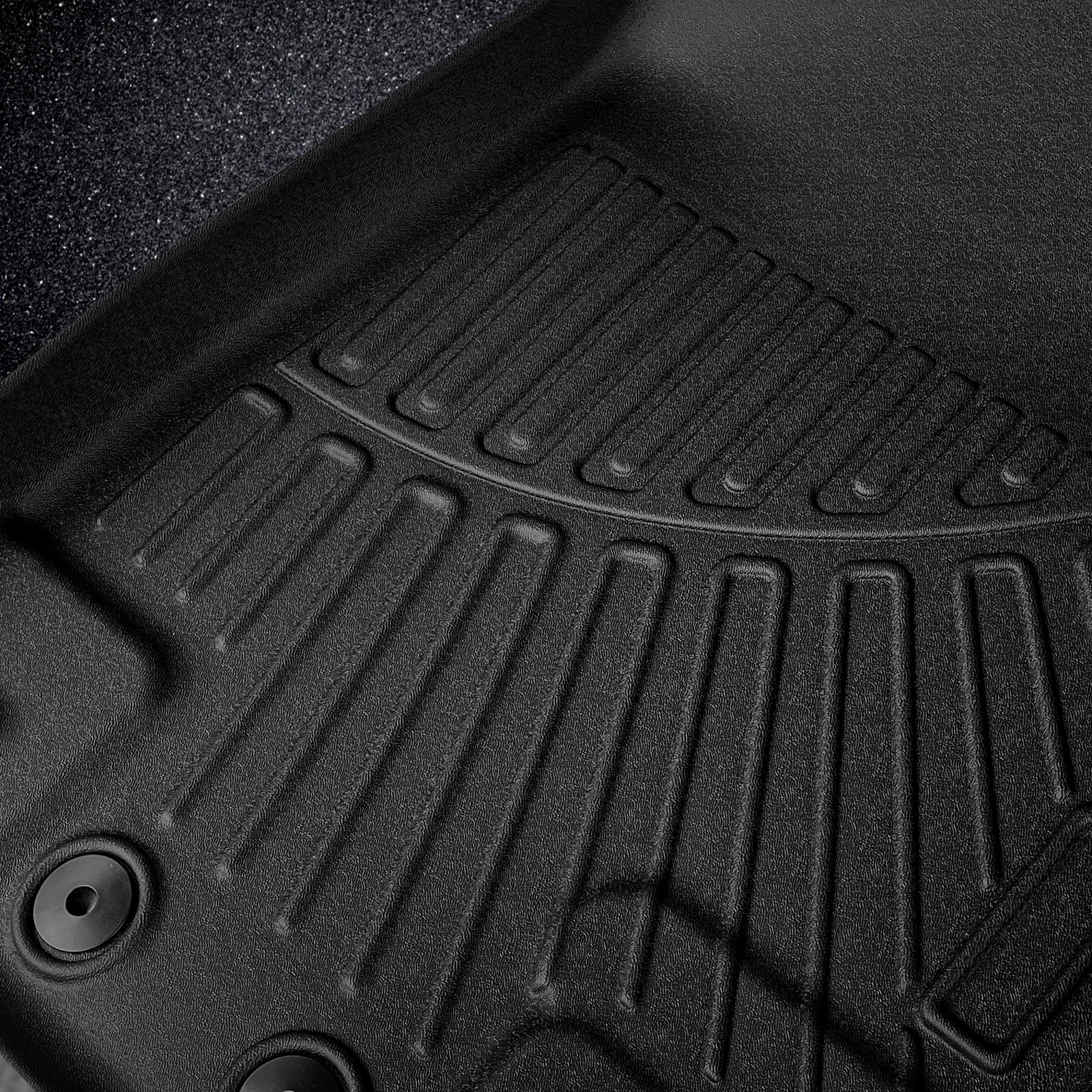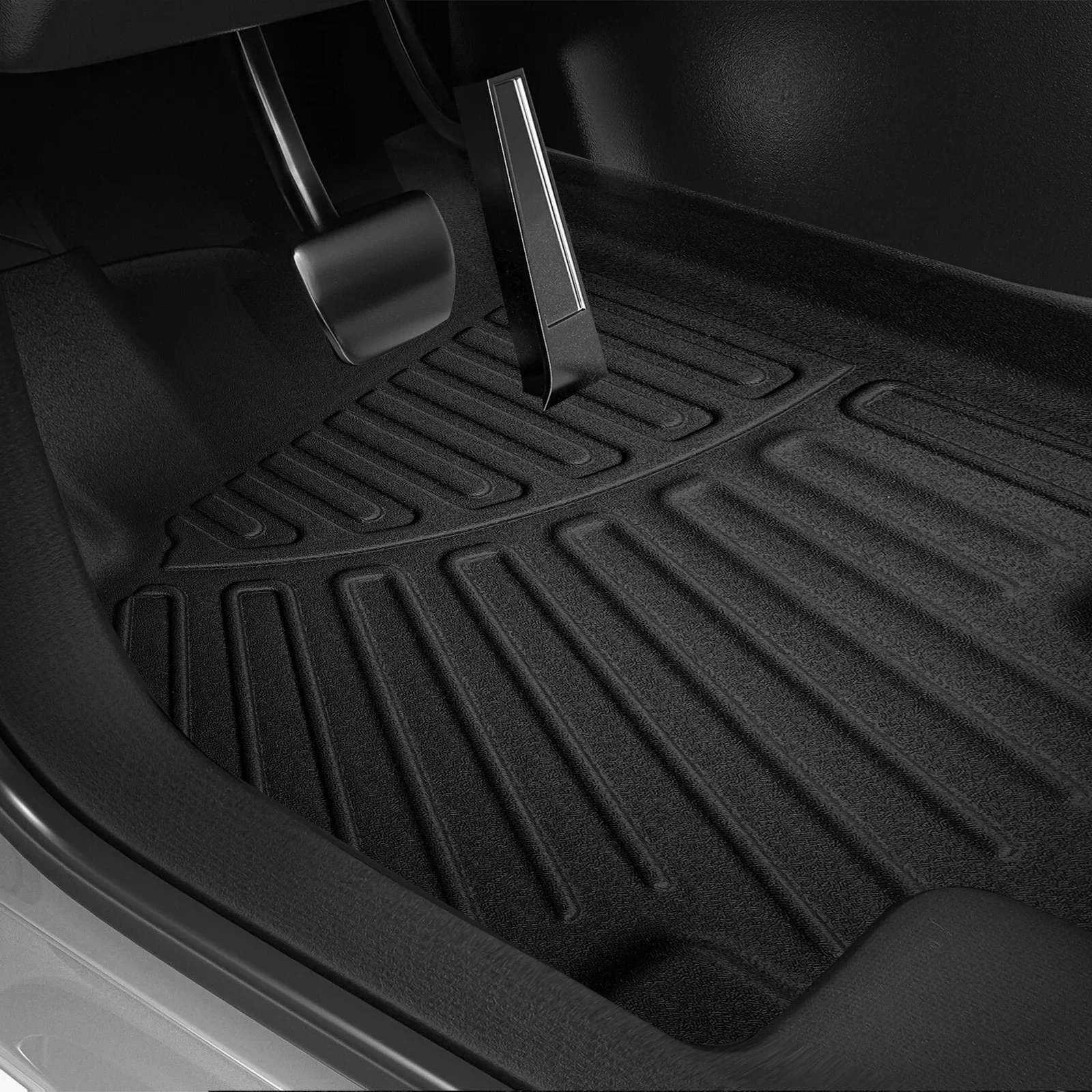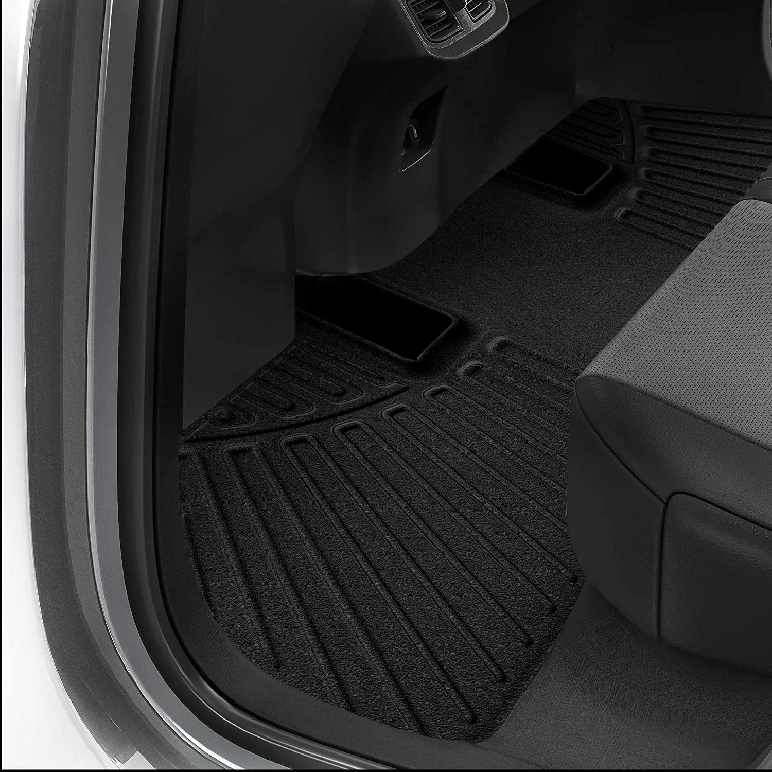 Perfect Fit: Via digital 3D scanning technology for precise measurement, these foot pads and cargo mat exactly fit the front, rear, and corners of the car's interior carpet, ensuring perfect fit without trimming. They will not obstruct the throttle or brake pedals. Modern and elegant black look makes these mats complement your car interior.