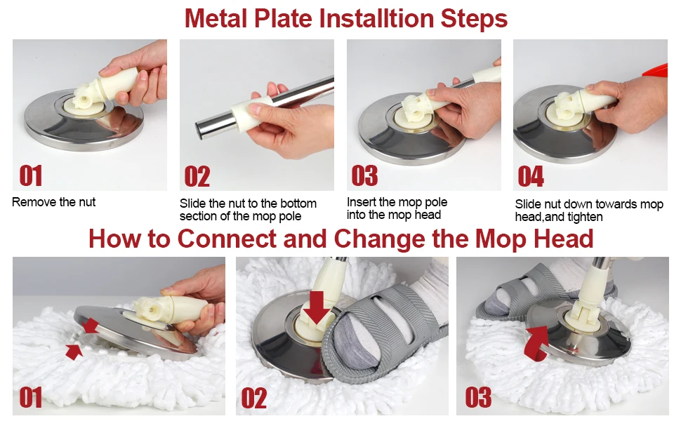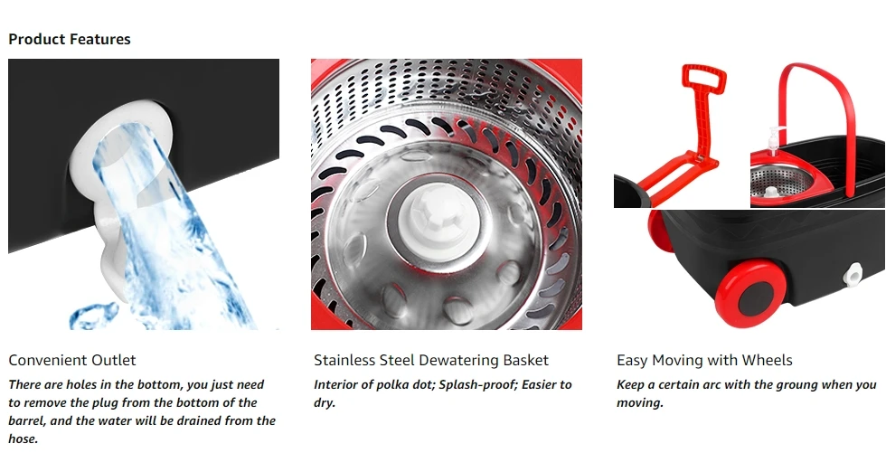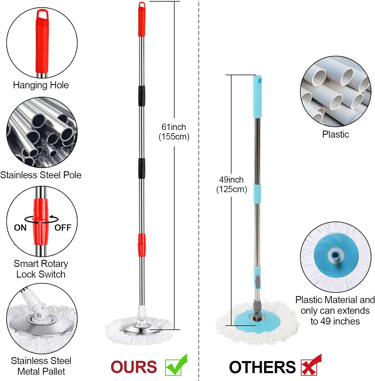 Quality material - unlike others, basket, wringer, pallet and handle of our spin mop are Made of durable stainless steel and PP. Upgraded handle allows the mop head to wing drier and make less noise. The telescoping handle adjusts up to 61 inch, so you don’t have to bend down and suffer from back pain